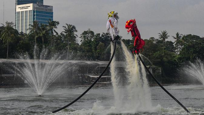 Sebelumya, pertunjukan ini sebelumnya telah sukses memukau penonton di Guangxi, China, dan Sydney, Australia, sebelum akhirnya hadir secara perdana di Jakarta. Tampak dalam foto, penampil mengenakan kostum barongsai beratraksi Aerial Lion Dance di Danau Senayan Park, Jakarta, 14 Februari 2026. (merdeka.com/Arie Basuki)